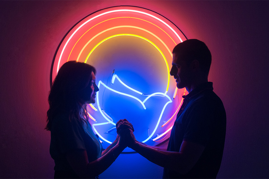 A trama de “Divino Amor” se passa em 2027 e apresenta uma sociedade obcecada pela religião, em que raves viraram cultos e a novidade da vez são cabines de conselhos espirituais no estilo fast food. Neste mundo, Joana (Dira Paes) vive sua fé de forma mais antiquada. Ela participa de um coletivo religioso que resiste às tendências pós-modernas de seu tempo, e tenta se aproximar de Deus enquanto ela e o marido, Danilo (Julio Machado), buscam engravidar pela primeira vez.