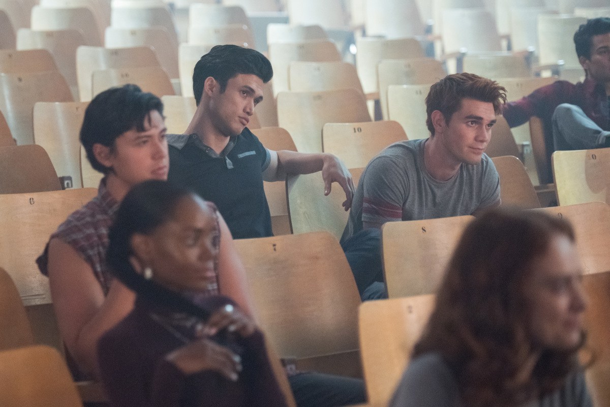 Riverdale -- "Chapter Fifty-One: BIG FUN" -- Image Number: RVD316c_0257b.jpg -- Pictured (L-R, T-B): Charles Melton as Reggie, Jordan Connor as Sweet Pea, KJ Apa as Archie, Ashleigh Murray as Josie and Zoe De Grande Maison as Evelyn Everneverà-- Photo: Dean Buscher/The CW -- é 2019 The CW Network, LLC. All rights reserved.