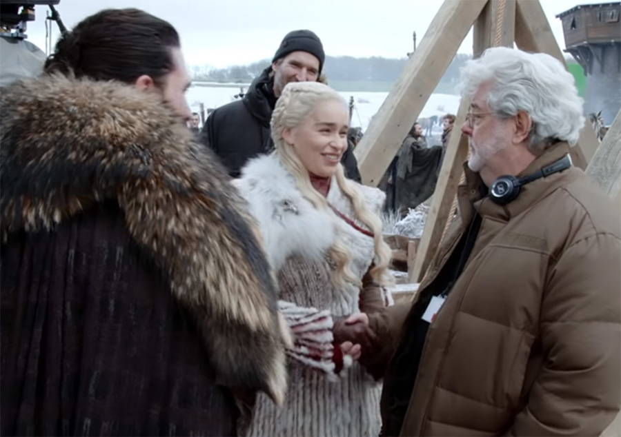 A HBO divulgou um vídeo (infelizmente, ainda sem legendas) com os bastidores das filmagens da estreia da 8ª temporada de “Game of Thrones”. E junto de diversas entrevistas e making of das gravações, o vídeo revela uma surpresa. George Lucas, o criador de “Star Wars”, foi visitar o set e acabou dirigindo uma cena do episódio.