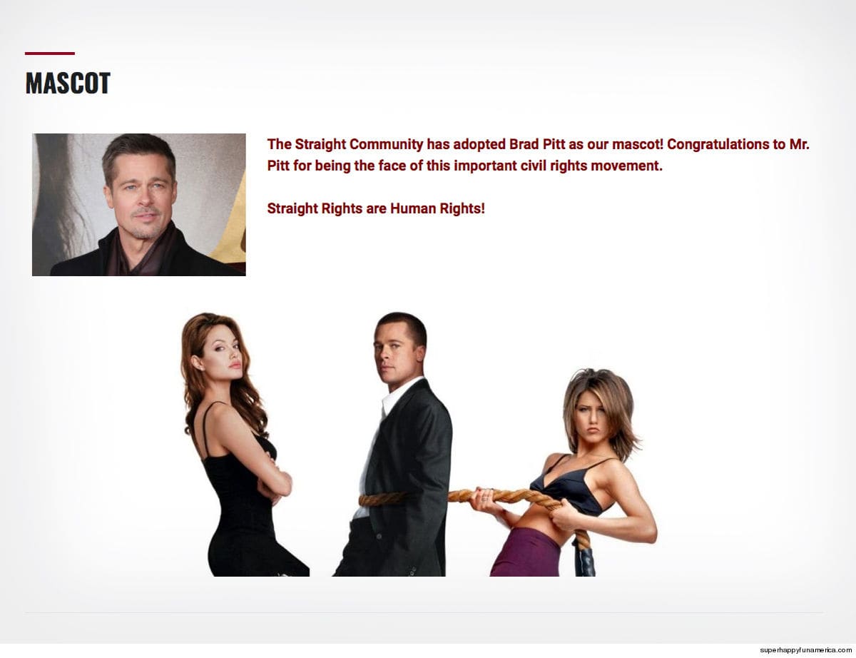 A página do evento destacou Pitt numa montagem, em que ele é disputado por suas duas ex-mulheres, Angelina Jolie e Jennifer Aniston. Ao lado dessa imagem de revista de fofoca, os organizadores do movimento acrescentaram um texto que diz: “A comunidade heterossexual adotou Brad Pitt como o nosso mascote! Parabéns ao Sr. Pitt por ser o rosto deste importante movimento social. Direitos heterossexuais são direitos humanos!”. Veja uma foto do post original abaixo.