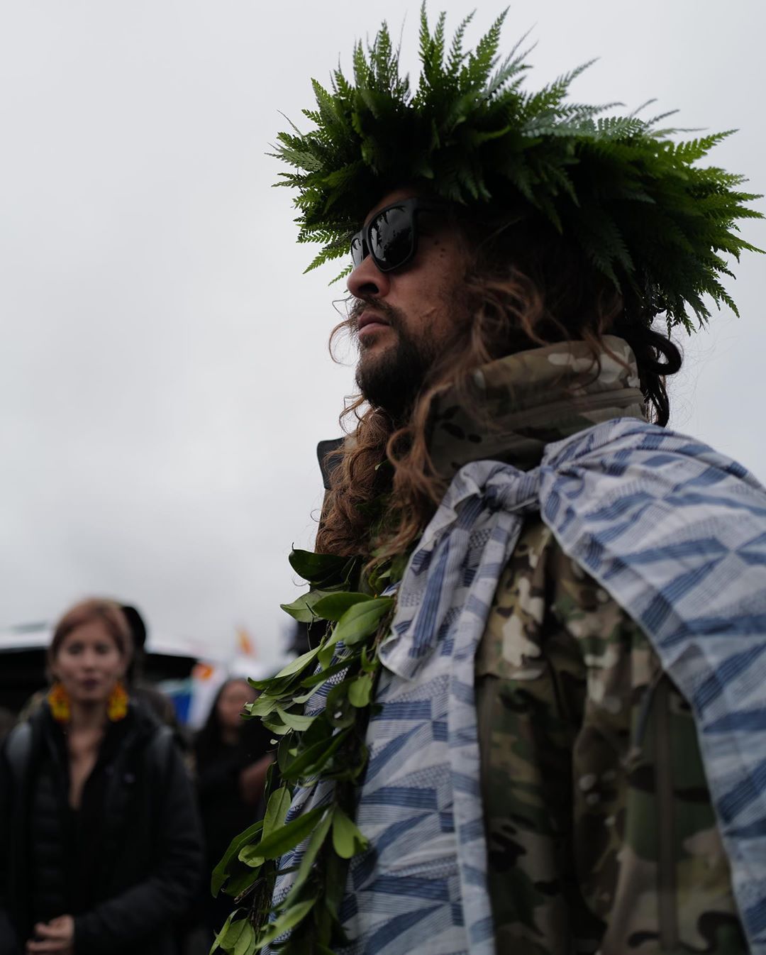 Momoa apareceu vestido com um colar e uma coroa de folhas, participando de uma cerimônia no local, junto de seus filhos Nakoa-Wolf Momoa e Lola Momoa.