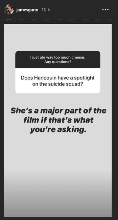 O diretor James Gunn revelou a extensão da participação de Arlequina no novo “Esquadrão Suicida”, ao responder perguntas de fãs nas redes sociais.