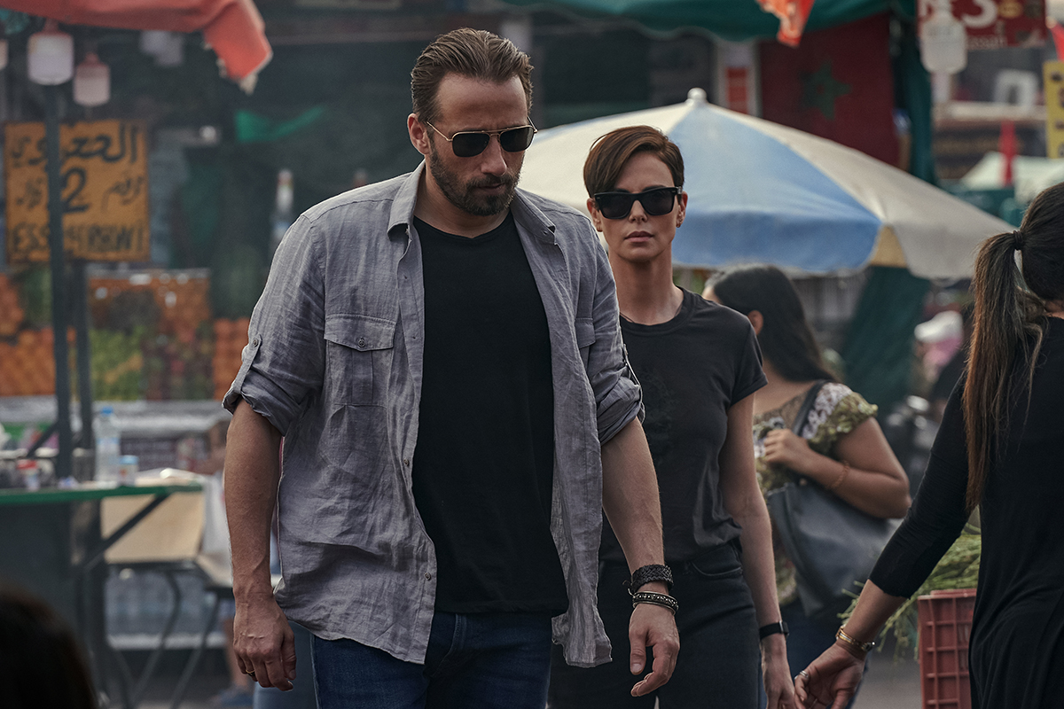 THE OLD GUARD (L to R) MATTHIAS SCHOENAERTS as BOOKER and CHARLIZE THERON as ANDY in THE OLD GUARD. Cr. AIMEE SPINKS/NETFLIX © 2020