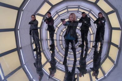 The 100 -- "Anaconda" -- Image Number: HU713a_0041r.jpg -- Pictured (L-R): Lindsey Morgan as Raven, Shannon Kook as Jordan Green, Eliza Taylor as Clarke, Jarod Joseph as Miller and Jessica Harmon as Niylah -- Photo: Shane Harvey/The CW -- 2020 The CW Network, LLC. All rights reserved.