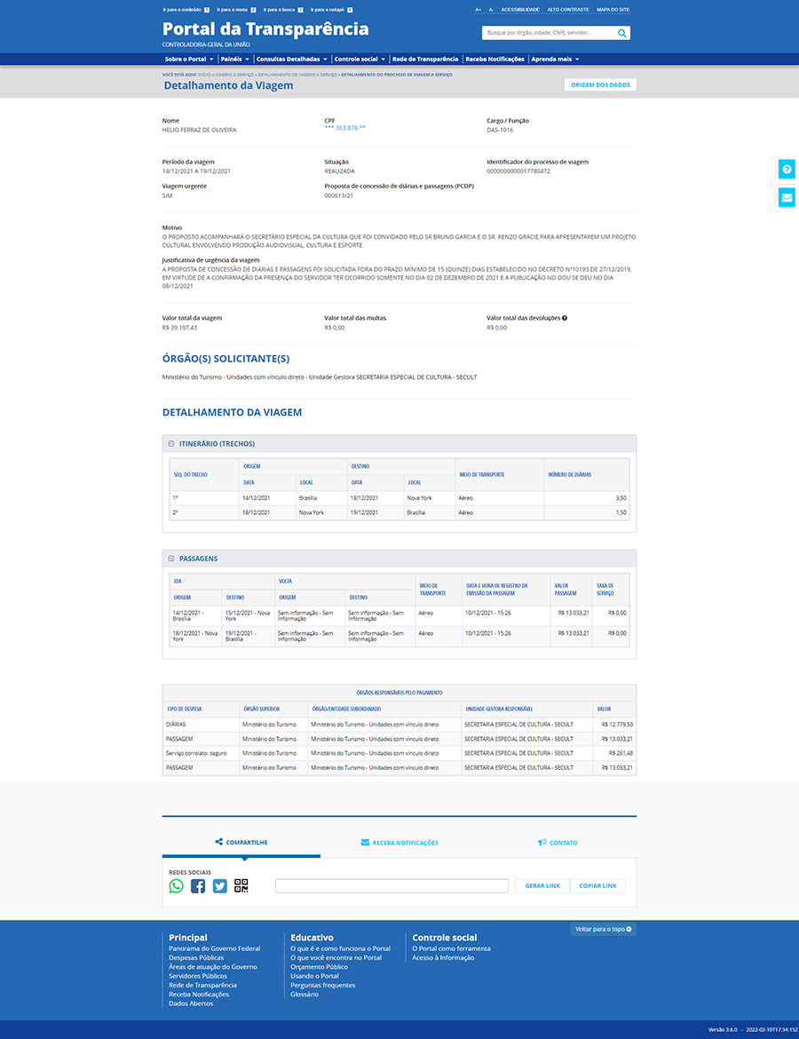 Veja abaixo as informações fornecidas pelo Porta da Transparência sobre as viagens de Mario frias e Hélio Ferraz a Nova York.