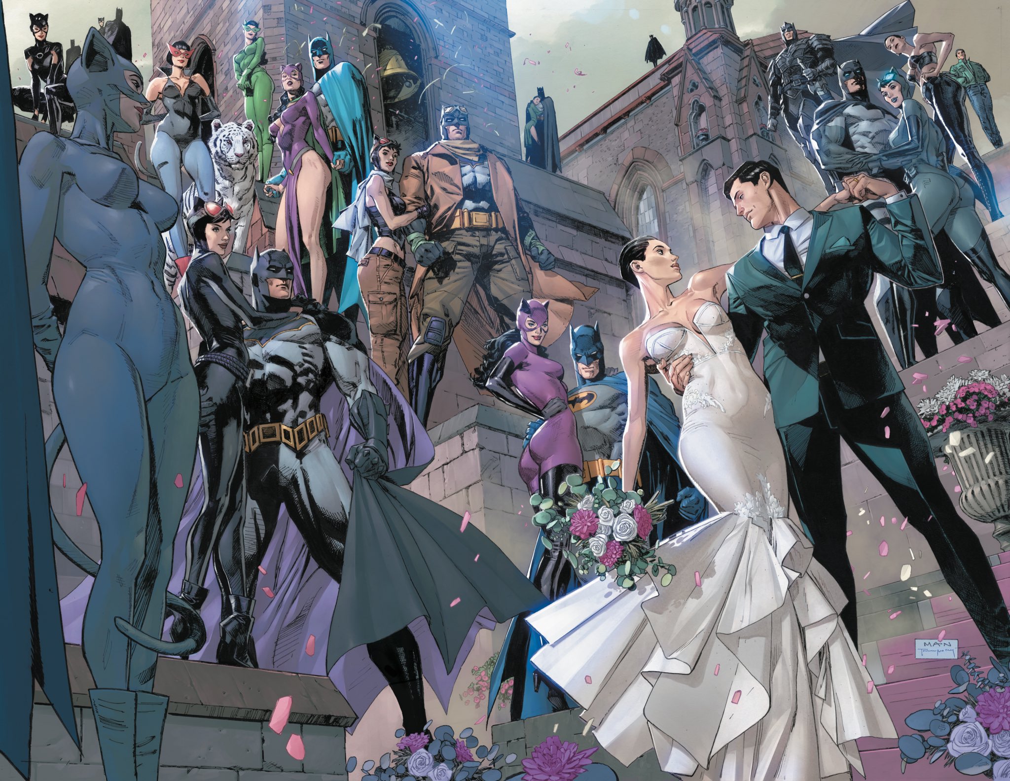 Batman e Mulher-Gato vão se casar nos quadrinhos. E desta vez pode ser pra valer. Depois de uma tentativa frustrada de 2018, marcada para a edição de nº 50 do reboot da revista “Batman”, o casamento voltou a ser anunciado para o número 12 da nova minissérie “Catwoman”, prevista para durar 14 edições. O artista Clay Mann publicou no Twitter uma ilustração da capa da publicação, que traz Selina Kyle com vestido branco de noiva ao lado de Bruce Wayne, e com o casal cercado por diferentes versões de Batman e Mulher-Gato ao longo das décadas. No texto, ele presta homenagem ao roteirista Tom King, que assinou a história que deveria ser o casamento original. Na ocasião, Selina desistiu em cima da hora. Mesmo assim, a DC lançou várias publicações celebrando o casamento que não ocorreu. De certa forma, o casamento era inevitável, já que eles são pais de Helena Wayne, uma heroína do futuro, que foi introduzida em 1977 com a identidade da Caçadora. Embora os vários reboots da DC Comics tenham dado uma nova origem para a Caçadora, outra Helena Wayne, filha de Selina e Bruce, voltou a ser introduzida recentemente na cronologia oficial da DC Comics como a Batwoman do futuro. “Catwoman” 12 tem lançamento marcado para 12 de abril nos EUA. No more waiting…my cover to Batman/Catwoman #12 @TomKingTK @Clay_Mann_ @tomeu_morey pic.twitter.com/MEdWPpEEVN — CLAY MANN (@Clay_Mann_) March 16, 2022