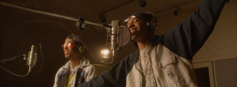 As imagens destacam o ex-BBB Lucas Penteado e o ator Juan Paiva caracterizados como Claudinho e Buchecha, respectivamente, além do diretor Eduardo Albergaria (da série “Ed Mort”) num registro de bastidores.