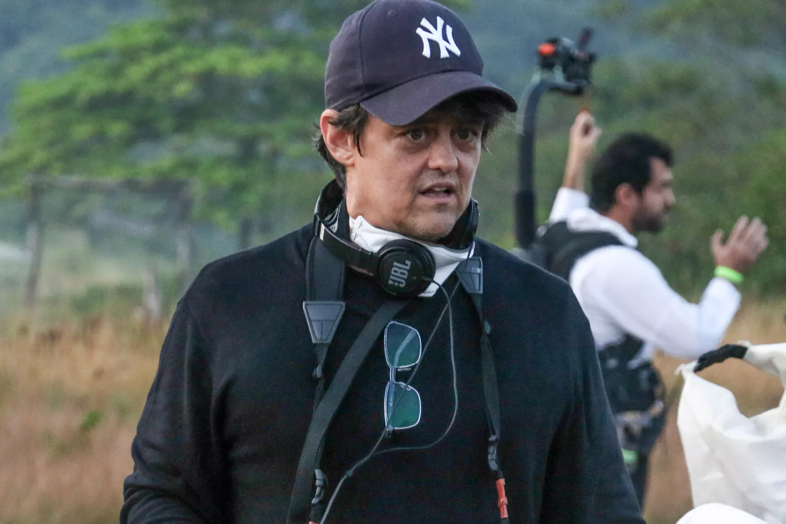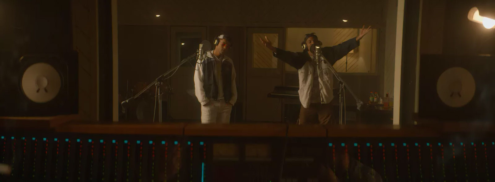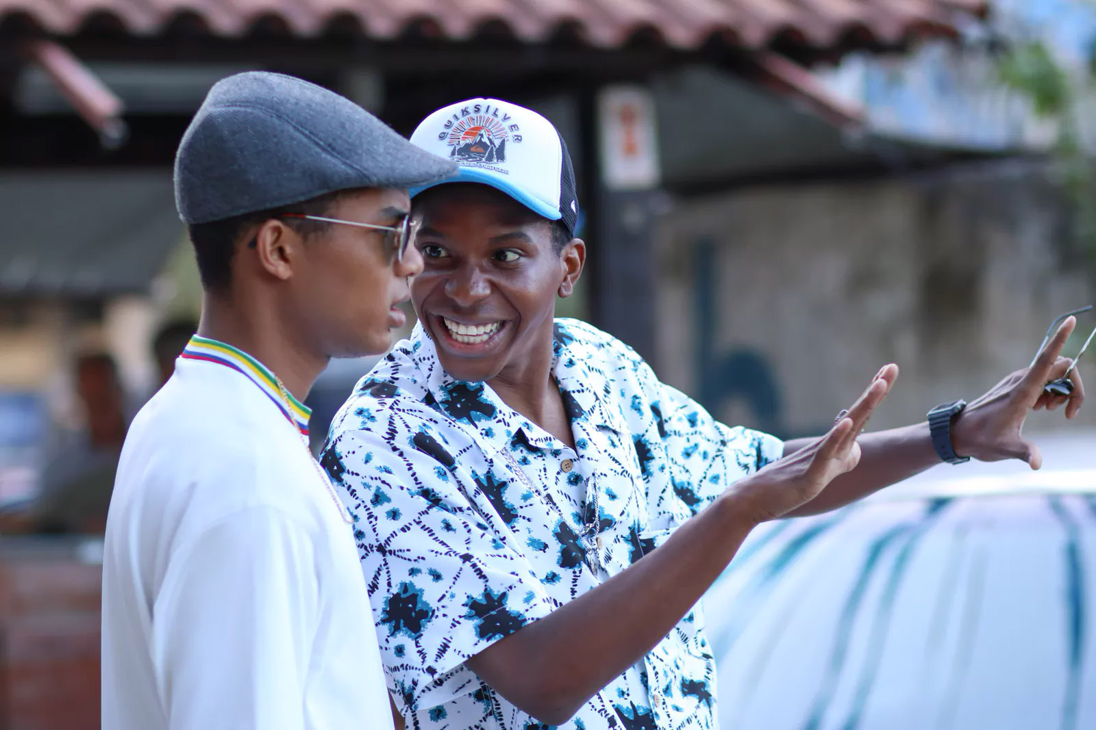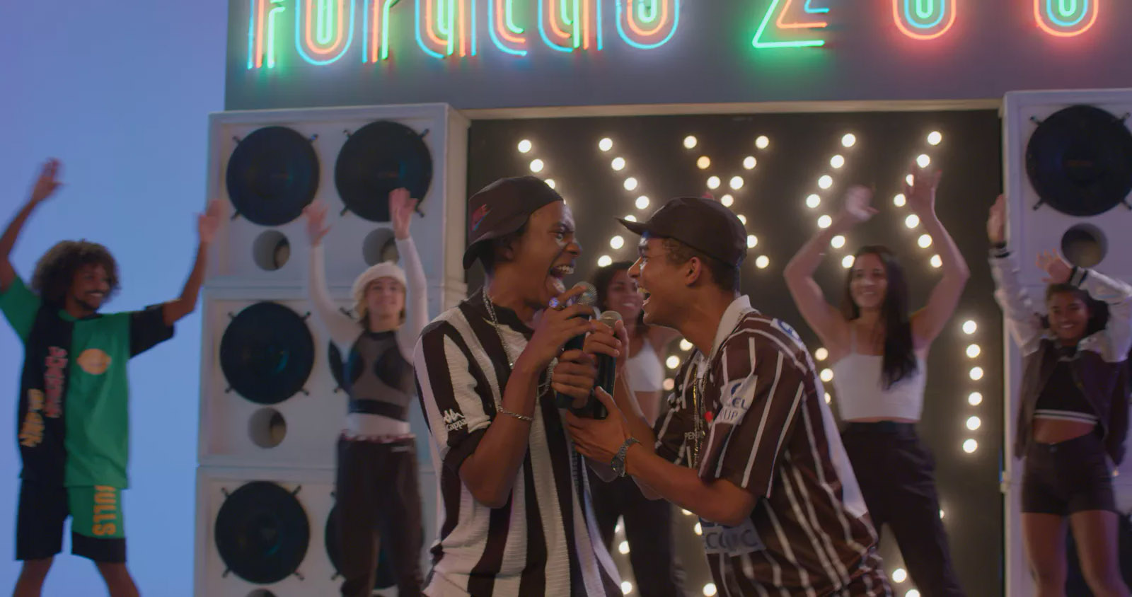As imagens destacam o ex-BBB Lucas Penteado e o ator Juan Paiva caracterizados como Claudinho e Buchecha, respectivamente, além do diretor Eduardo Albergaria (da série “Ed Mort”) num registro de bastidores.