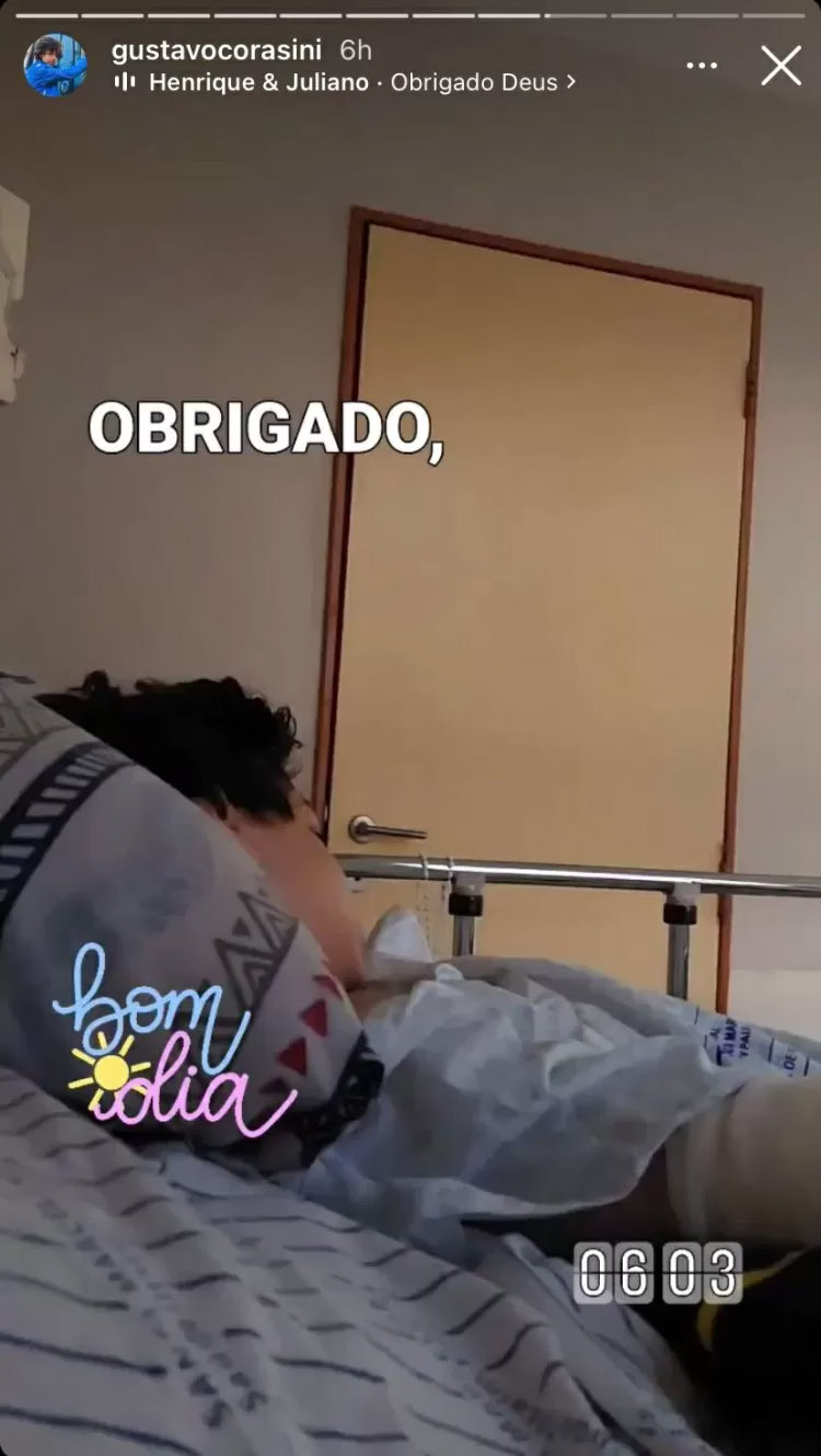 Gustavo tirou a sonda e começou a se alimentar com frutas e a beber água. O progresso no estado de saúde dele foi a motivação do post. Fernanda Corasini ainda acrescentou à imagem: “Obrigado, bom dia”.