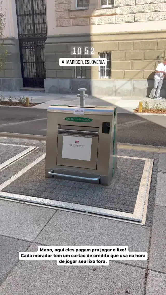 “Gente, olha só que interessante. Isso aqui é o lixo de Maribor, aí cada morador tem um cartão de crédito, e eles pagam para colocar o lixo, e aí é cobrado pela quantidade de lixo que tem por mês, ou ano, não sei”, mostrou Eslô em vídeos de seus Stories.
