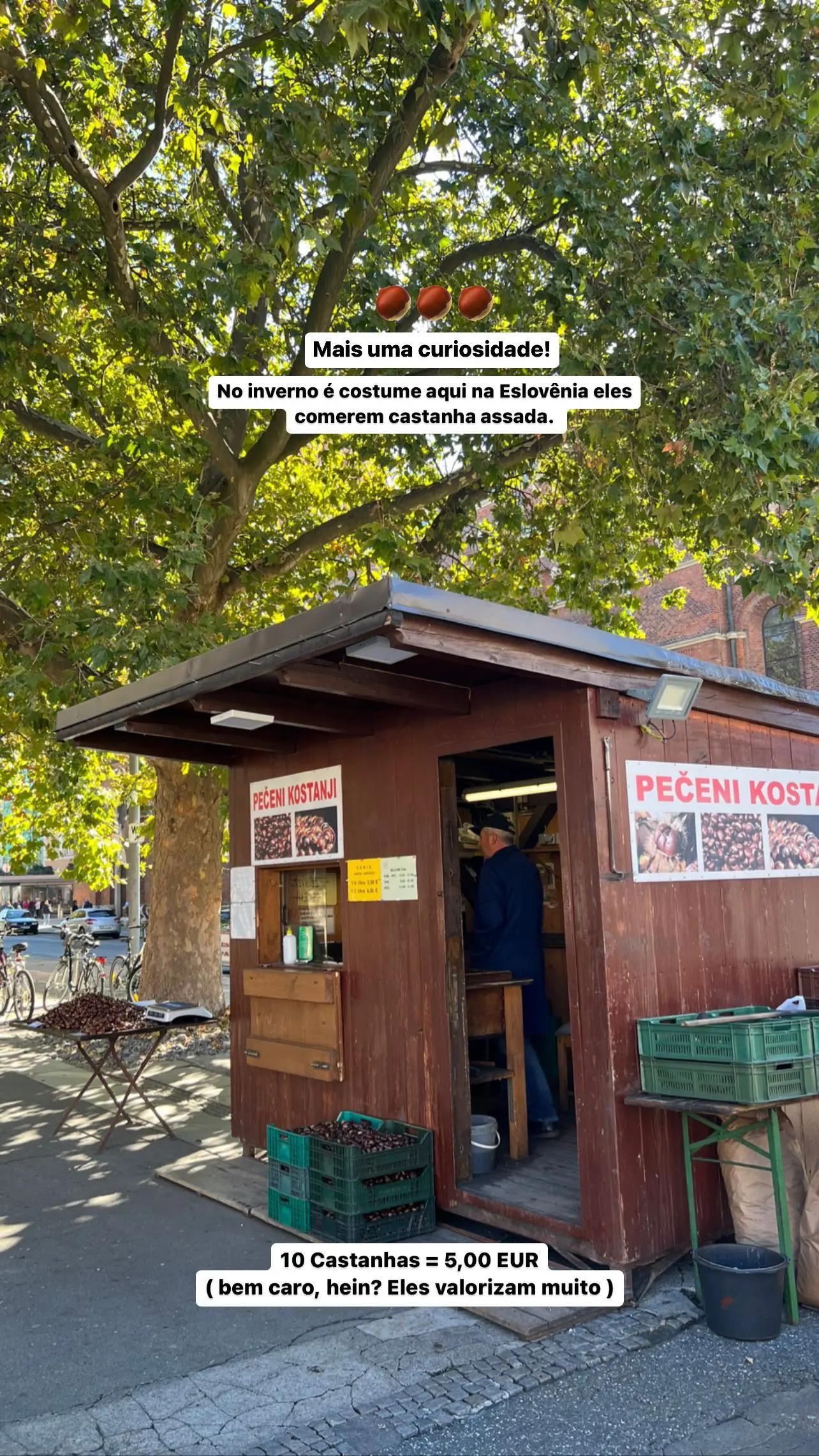 “Mais uma curiosidade. No inverno, é costume aqui na Eslovênia eles comerem castanha assada. 10 castanhas = 5 euros. Bem caro, hein? Eles valorizam muito”, continuou. Eslovênia ainda falou sobre o comportamento dos moradores do país.
