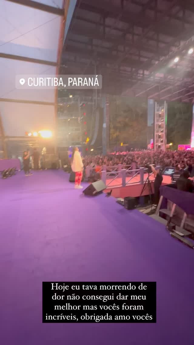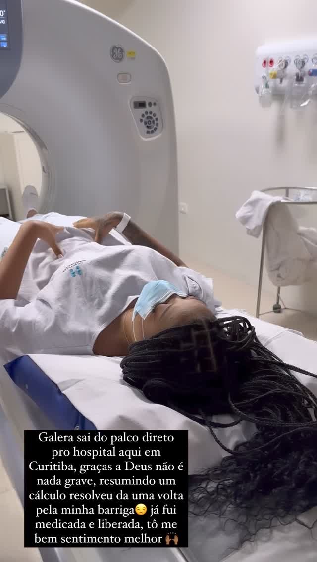 Em uma publicação nos stories do Instagram, ela mostrou o momento em que passava por exames. “Galera, saí do palco direto para o hospital aqui em Curitiba. Graças a Deus não é nada grave. Resumindo, um cálculo resolveu dar uma volta pela minha barriga”, contou.