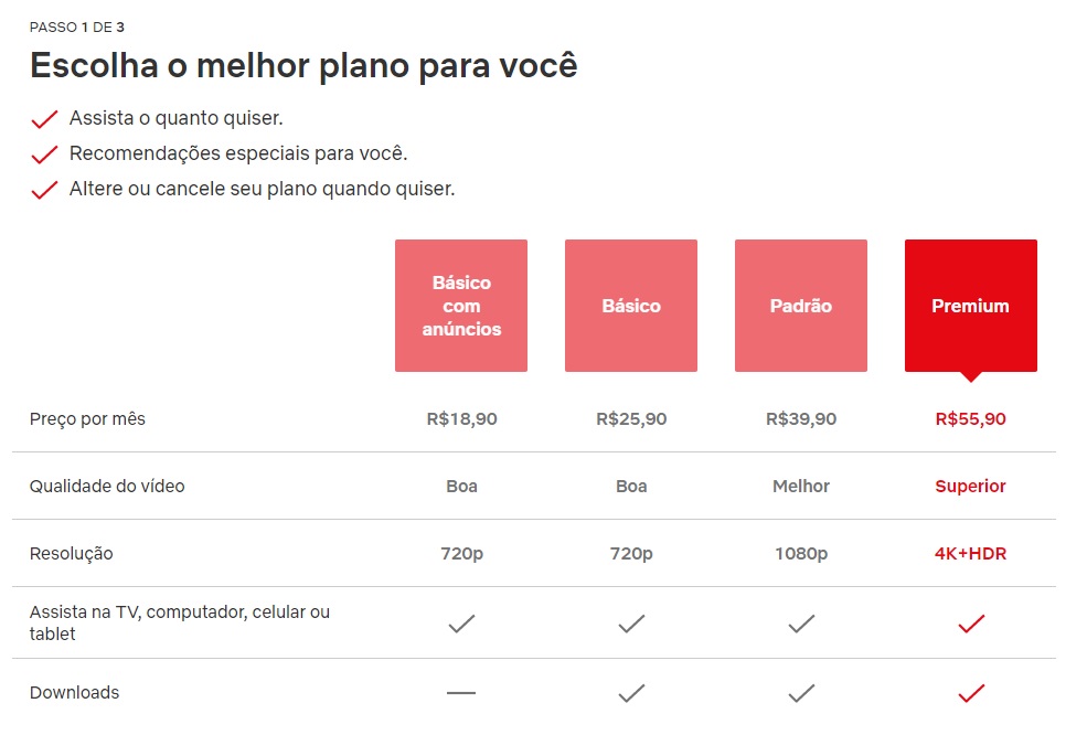 A Netflix ainda apresenta um plano premium, que custa R$55,90 e o único que oferece resolução em 4k, além de permitir acesso simultâneo a um número maior número de telas.