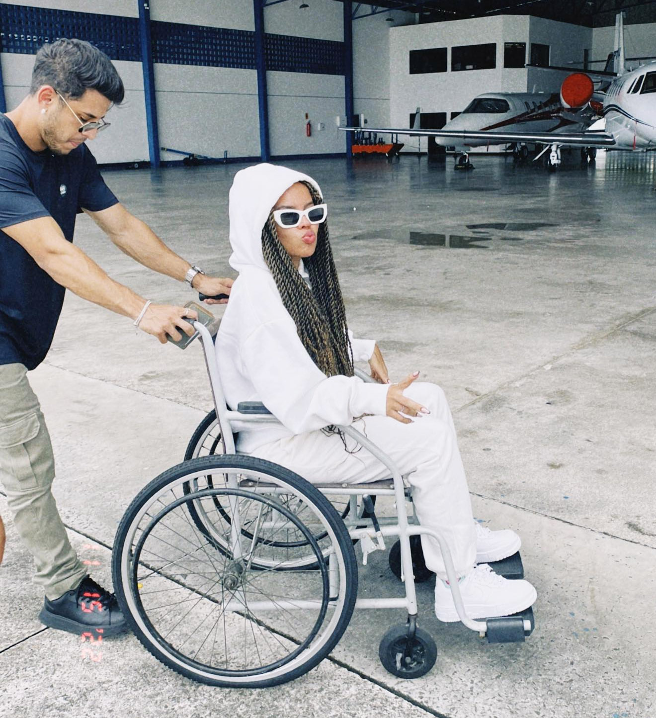 “Voltando para casa. Toda glória seja dada a Deus que até aqui me sustentou e me livrou de todo mal”, legendou ela junto de fotos, que registraram sua chegada num aeroporto, empurrada de cadeira de rodas pelo namorado.