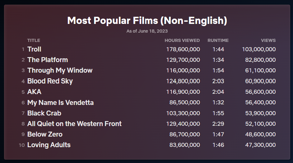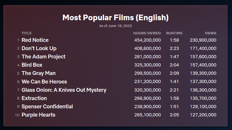 Já no ranking geral dos filmes, o mais assistido é a ação “Alerta Vermelho”, com 230 milhões de visualizações. Nas duas posições abaixo, estão “Não Olhe para Cima” e “O Projeto Adam”, marcando 171 milhões e 157 milhões de visualizações, respectivamente.