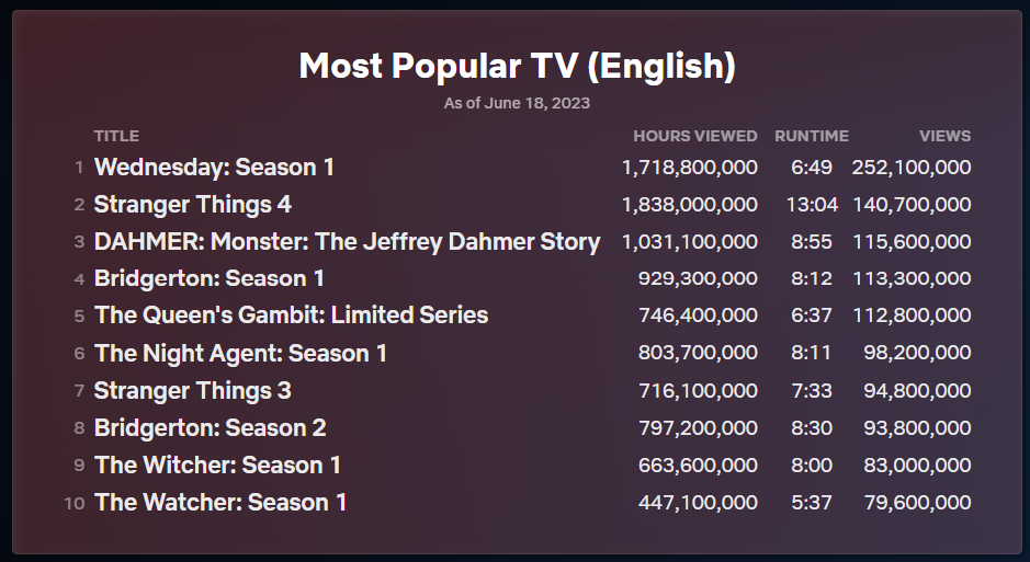 O novo ranking também preserva a medição de horas totais. Com isso, é possível ver que “Stranger Things” ainda supera “Wandinha” em números brutos, com 1,8 bilhão de horas. Só que o 4º ano da série teve 9 episódios que totalizaram 13 horas e 4 minutos, mais que o dobro da temporada de estreia de “Wandinha”.