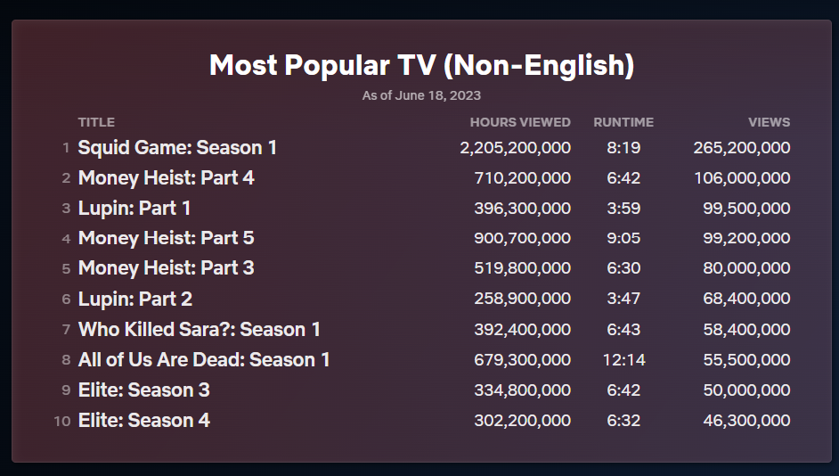 A alteração não afetou o status de “Round 6” como série mais vista da Netflix em todos os tempos. A atração sul-coreana aparece no ranking das séries não faladas em inglês com 265 milhões visualizações. Mas vale apontar que sua distância para “Wandinha” é bem menor que o antigo ranking apontava.