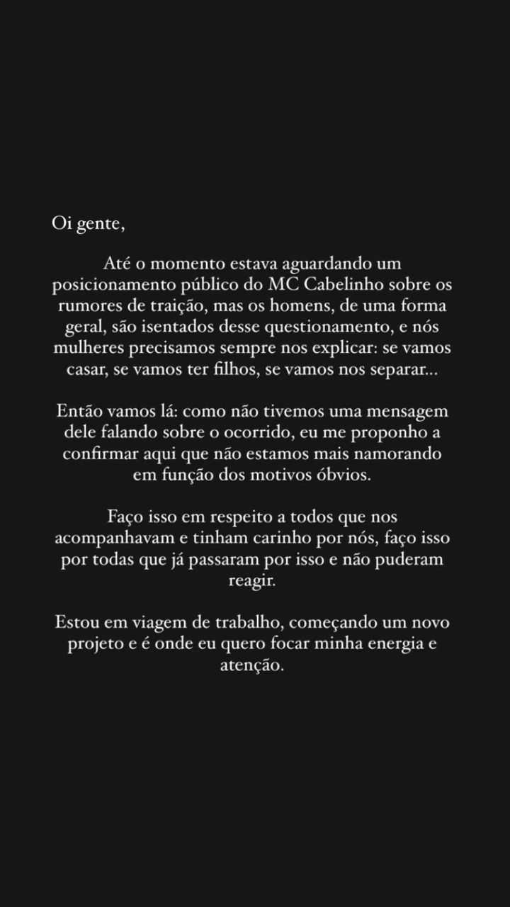 Diante da confirmação, Bella ainda aguardou toda a segunda-feira por alguma declaração do namorado. “Até o momento estava aguardando um posicionamento público do MC Cabelinho sobre os rumores de traição”, ela escreveu em seu Stories. “Mas os homens, de uma forma geral, são isentados desse questionamento, e nós mulheres precisamos sempre nos explicar: se vamos casar, se vamos ter filhos, se vamos nos separar”, disparou.