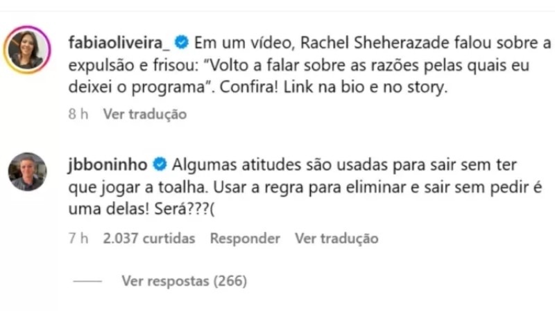 “Em um vídeo, Rachel Sheherazade falou sobre a expulsão e frisou: ‘Volto a falar sobre as razões pelas quais eu deixei o programa'”, relatou a colunista no perfil. Em seguida, Boninho ponderou: “Algumas atitudes são usadas para sair sem ter que jogar a toalha. Usar a regra para eliminar e sair sem pedir é uma delas! Será?”.