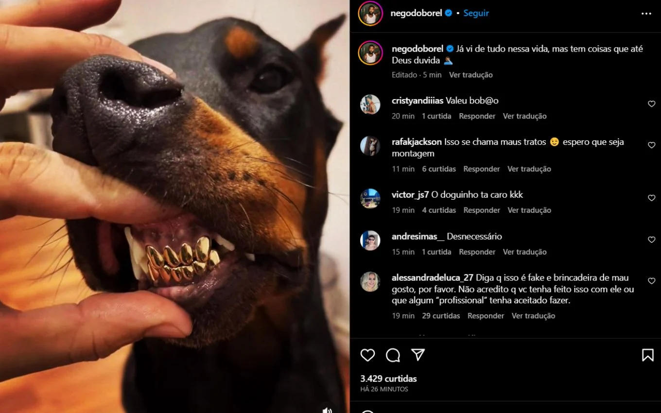Nego do Borel enfrenta uma onda de críticas após compartilhar uma imagem controversa em suas redes sociais. A foto mostra um cachorro com dentes aparentemente revestidos de ouro. “Meu cachorro tem que ser assim, igual o dono”, escreveu o polêmico ex-Fazenda na legenda. A publicação gerou reações negativas, com acusações de maus-tratos ao animal.