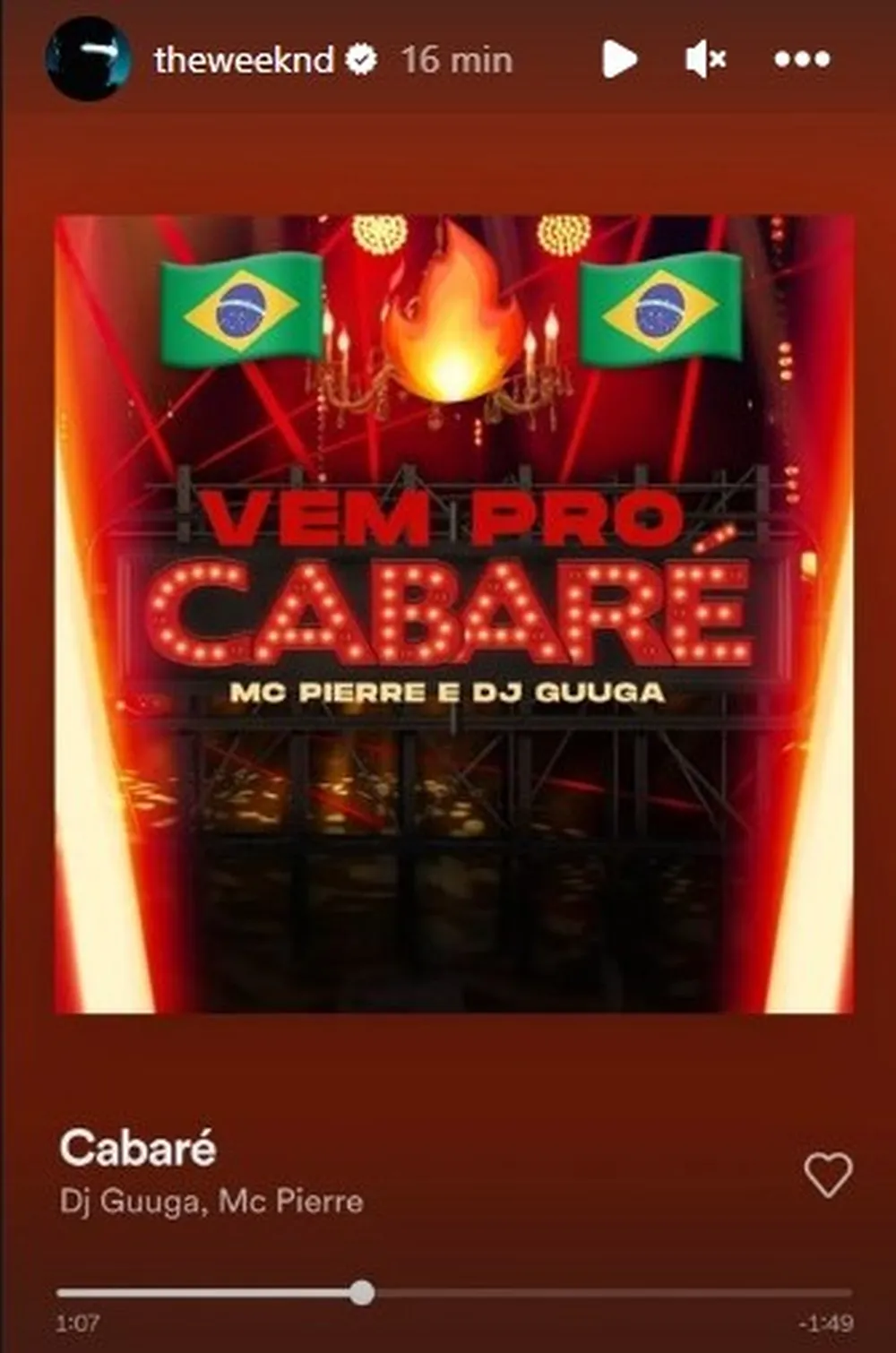 Não foi apenas o forró que chamou a atenção de The Weeknd. O artista também compartilhou em seu perfil a música “Cabaré”, de DJ Guuga e Mc Pierre. “Quer esquecer sua ex-mulher? Vem pro cabaré”, diz o refrão da canção, ampliando o leque de influências brasileiras que o cantor demonstrou apreciar.