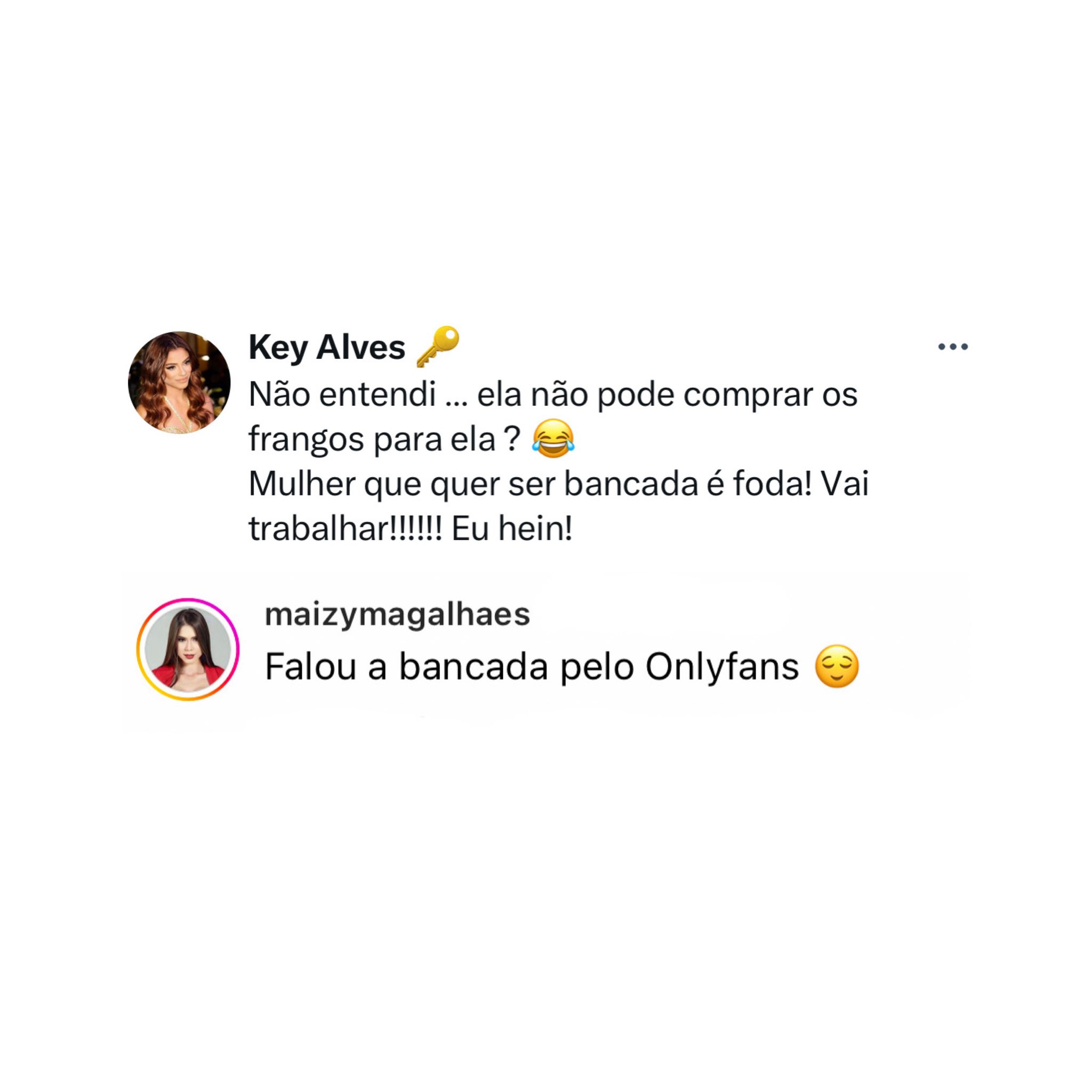 A acusação fez a ex-BBB Key Alves se manifestar. Ela escreveu um comentário criticando a postura de Maizy: “Não entendi… Ela não pode comprar [os produtos] para ela? Mulher que quer ser bancada é f**a! Vai trabalhar! Eu hein!”.