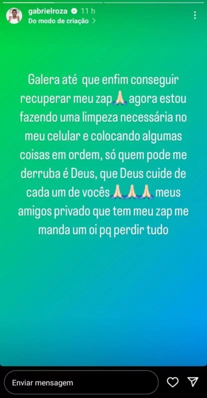 Gabriel Roza deu legitimidade ao material ao confirmar no Instagram que teve o aplicativo de mensagens invadido. “Galera, acordei e vi essa repercussão doida. Não entendi nada. Fiquei 48 horas sem acesso ao meu zap, que foi hackeado. Recuperei ontem à noite e estou até agora fazendo limpeza. Mais tarde faço um pronunciamento. Bom dia!”, ele postou nesta terça (12/12).