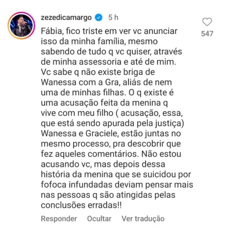 Zezé Di Camargo envolveu-se em nova polêmica com o filho Igor ao defender sua noiva, Graciele Lacerda, em resposta a uma publicação sobre uma antiga briga entre ela e sua filha Wanessa Camargo em 2011. a
