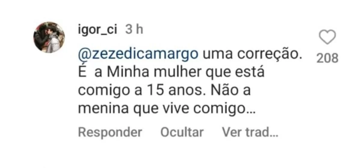 Igor não demorou a responder ao comentário do pai. Em uma postagem no Instagram, ele enfatizou: “Uma correção, é minha mulher, que está comigo há 15 anos. Não é a menina que vive comigo”.