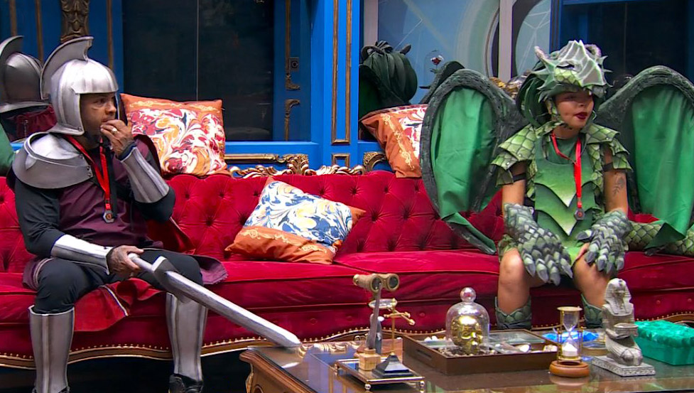Rodriguinho e Giovanna Pitel gostaram das fantasias do Monstro. O pagodeiro, que dizia que desistiria se fosse colocado no Monstro, até elogiou a qualidade do traje. Ele ganhou uma roupa de cavaleiro medieval, enquanto a sister se vestiu de dragão. Os dois brincaram bastante assim que vestiram os trajes. Temido pelos competidores, desta vez o castigo do Monstro está sendo encarado como estratégia. Os castigados pediram para Fernanda Bande, vencedora da Prova do Anjo, para serem indicados. O objetivo foi confundir e não dar mais tempo de tela aos adversários, já que o Monstro ganha destaque na edição. Pitel e Rodriguinho já com as roupas do Castigo do Monstro. 😈 #BBB24 #RedeBBB pic.twitter.com/hblEULCvxc — Big Brother Brasil (@bbb) January 26, 2024