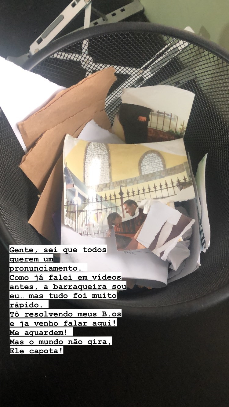 Além disso, ela fez as malas de Lucas e postou uma imagem nos Stories de fotografias do casal rasgadas e no lixo. “Sei que todos querem um pronunciamento”, escreveu junto da imagem. “Como já falei em vídeos antes, a barraqueira sou eu… Mas foi tudo muito rápido. Tô resolvendo meus BOs aqui e já venho falar aqui! Me aguardem! Mas o mundo não gira, ele capota!”