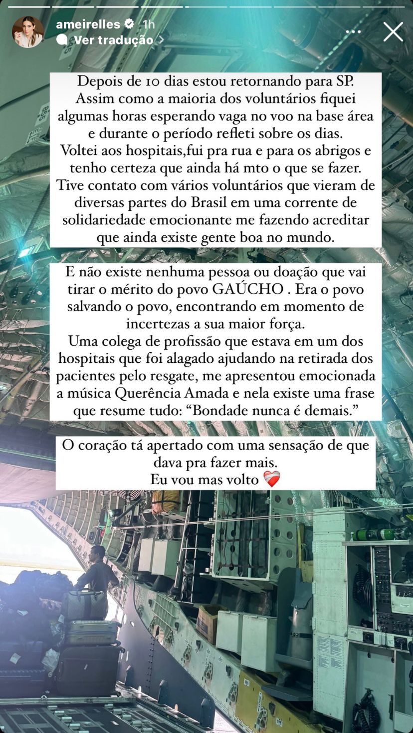 Nos Stories de seu perfil no Instagram, ela refletiu sobre a experiência e prometeu voltar ao estado gaúcho para retomar o trabalho: “Depois de dez dias estou retornando para São Paulo. Assim como a maioria dos voluntários, fiquei algumas horas esperando vaga no voo na base aérea e durante o período refleti sobre os dias”.