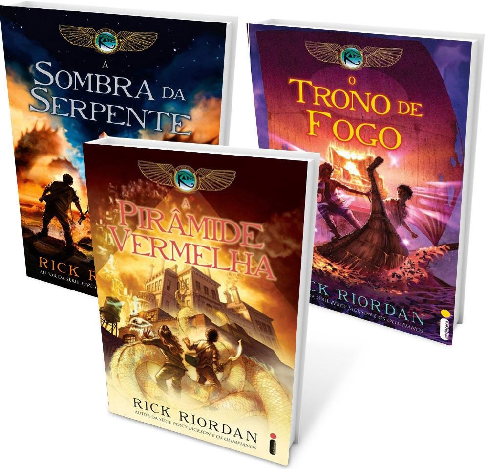 O primeiro volume é “A Pirâmide Vermelha” (The Red Pyramid), publicado em 2010, e a trilogia ainda inclui “O Trono de Fogo” (The Throne of Fire) e “A Sombra da Serpente” (The Serpent’s Shadow). Mas a história tem livros complementares e crossovers com outros universos do escritor.