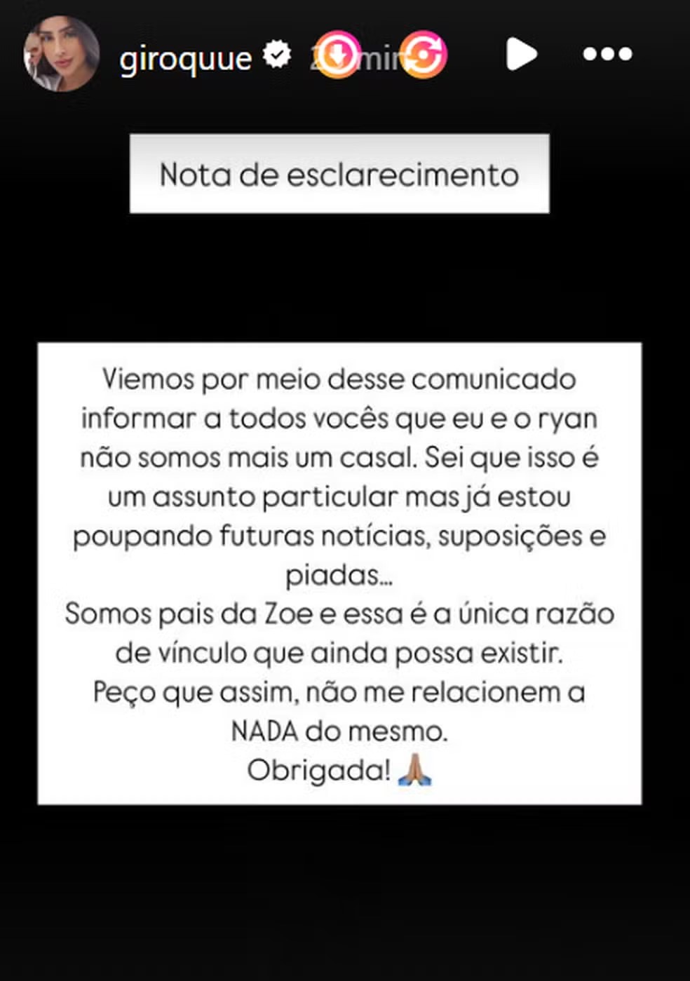 “Viemos por meio deste comunicado informar a todos vocês que eu e Ryan não somos mais um casal. Sei que isso é um assunto particular, mas já estou poupando futuras notícias, suposições e piadas… Somos pais da Zoe e essa é a única razão de vínculo que possa existir. Peço, assim, que não me relacionem a nada do mesmo. Obrigada”, escreveu Giovanna, em nota de esclarecimento.