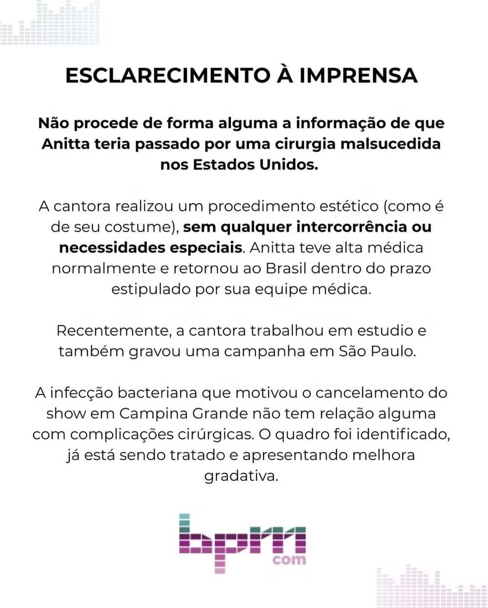 O comunicado reconheceu que Anitta realizou recentemente um procedimento estético, mas frisou que não houve qualquer intercorrência. “A cantora realizou um procedimento estético (como é de seu costume), sem qualquer intercorrência ou necessidades especiais. Anitta teve alta médica normalmente e retornou ao Brasil dentro do prazo estipulado por sua equipe médica. Recentemente, a cantora trabalhou em estúdio e também gravou uma campanha em São Paulo”, detalhou a nota.
