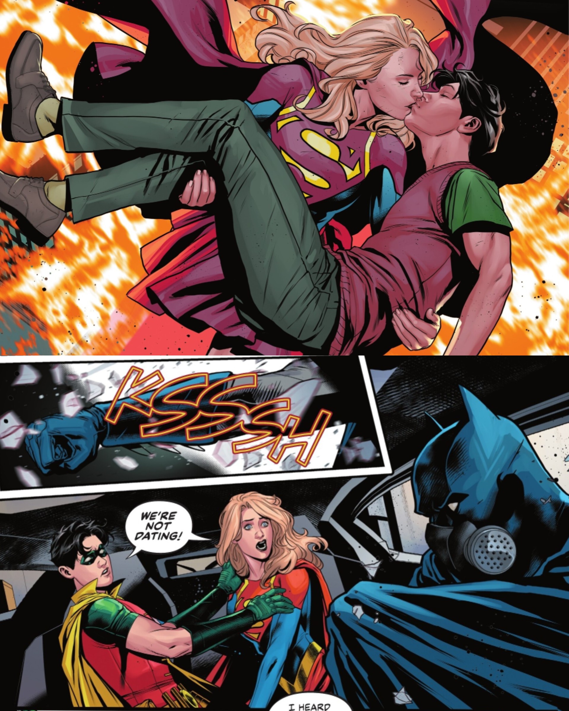 O romance relâmpago dura pouco: logo após o beijo, ambos retomam o comportamento provocador e trocam farpas. Quando Batman os encontra, o Cavaleiro das Trevas demonstra desconfiança, enquanto os jovens heróis negam qualquer envolvimento.