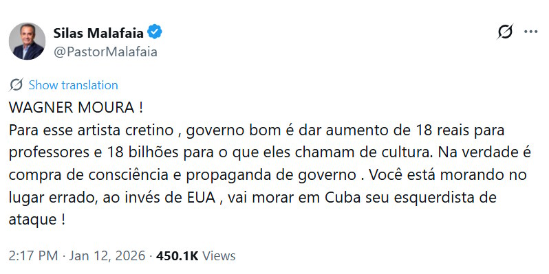 Especificamente sobre o ator, ele ainda acrescentou: “WAGNER MOURA! Para esse artista cretino, governo bom é dar aumento de 18 reais para professores e 18 bilhões para o que eles chamam de cultura. Na verdade é compra de consciência e propaganda de governo. Você está morando no lugar errado, ao invés de EUA, vai morar em Cuba seu esquerdista de ataque!”