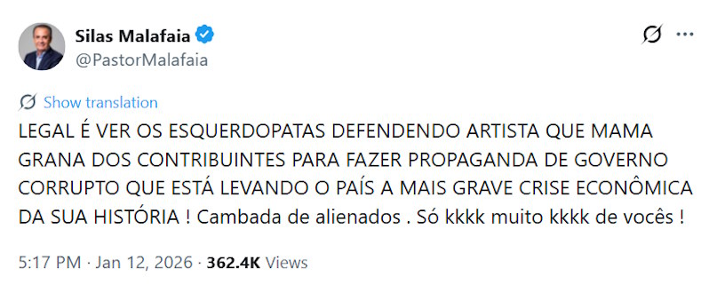 Malafaia utilizou suas redes sociais para atacar artistas que utilizam recursos públicos e direcionou ofensas específicas ao ator. “Legal é ver esquerdopatas defendendo artistas que mama grana dos contribuintes para fazer propaganda de governo corrupto. Cambada de alienados”, escreveu o religioso em uma das postagens publicadas em janeiro.