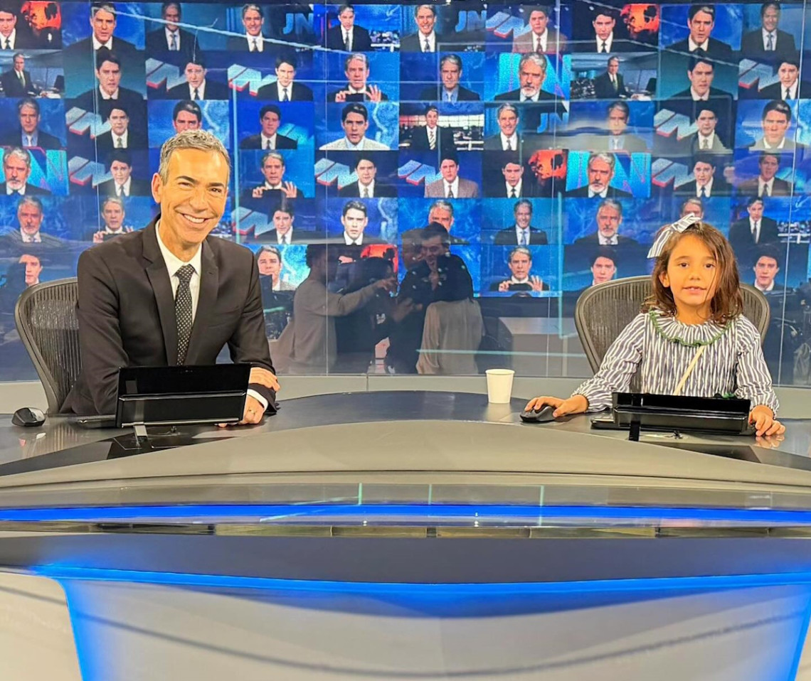 César Tralli leva filha à bancada do “Jornal Nacional”: “Tia Renata vai ficar brava?”
