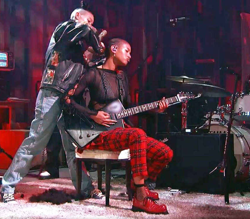 Willow Smith raspa o cabelo enquanto toca guitarra em show ao vivo