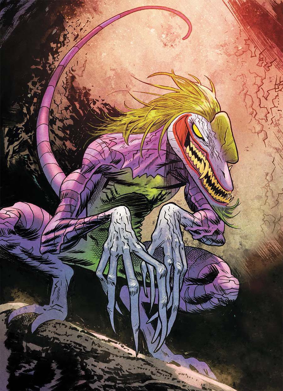O terceiro filme da franquia “Jurassic World” (e sexto desde “Jurassic Park”) vai apresentar um novo dinossauro ameaçador, que o diretor Colin Trevorrow diz ter sido inspirado pelo Coringa, vilão dos quadrinhos da DC Comics. “Eu queria algo que se parecesse com o Coringa”, Trevorrow contou à revista Empire. “Ele só quer ver o mundo queimar.” O nome oficial da nova criatura é Giganotosaurus, também conhecido “carinhosamente” como Giga. O mais curioso é que a DC criou mesmo um mistura de Coringa e dinossauro (ilustração acima). O “coringossauro” da editora será apresentado na minissérie “Jurassic League”, que traz heróis e vilões dos quadrinhos como dinossauros. O lançamento está marcado para 1 de maio nos EUA. Já “Jurassic World: Domínio” estreia no dia 2 de junho no Brasil, uma semana antes do lançamento nos EUA.