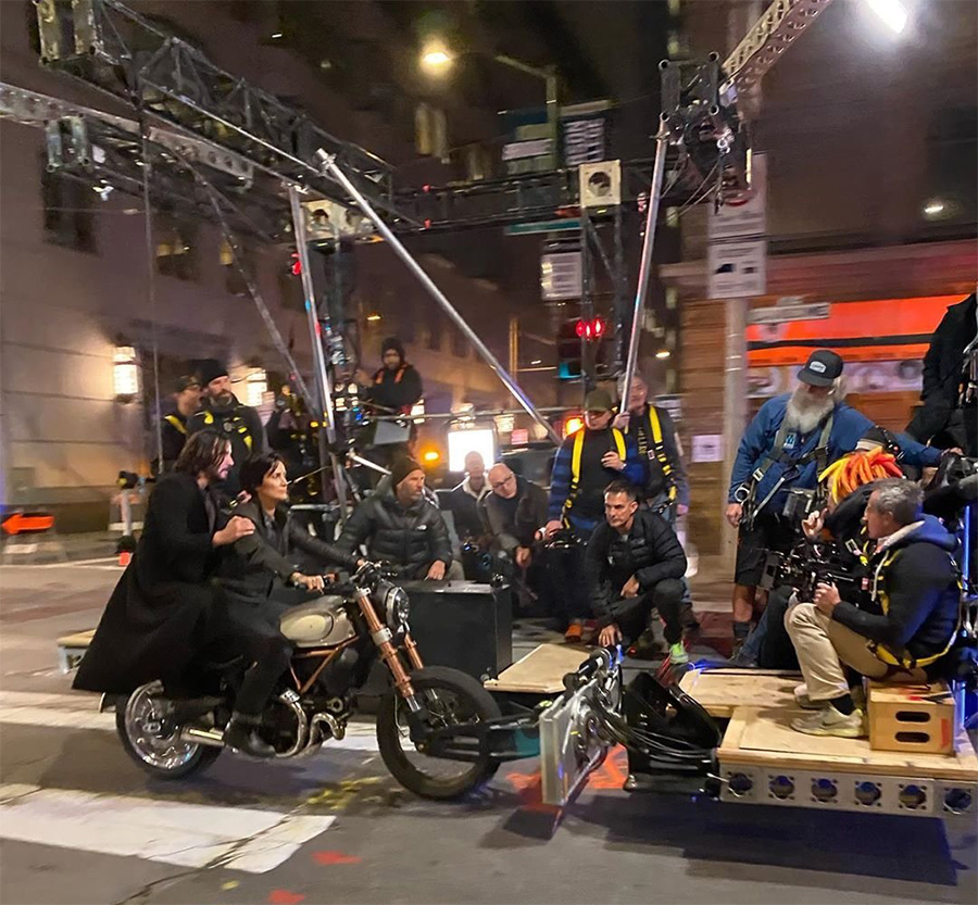Matrix 4: Vídeos do set flagram Keanu Reeves e Carrie-Anne Moss em cena motorizada
