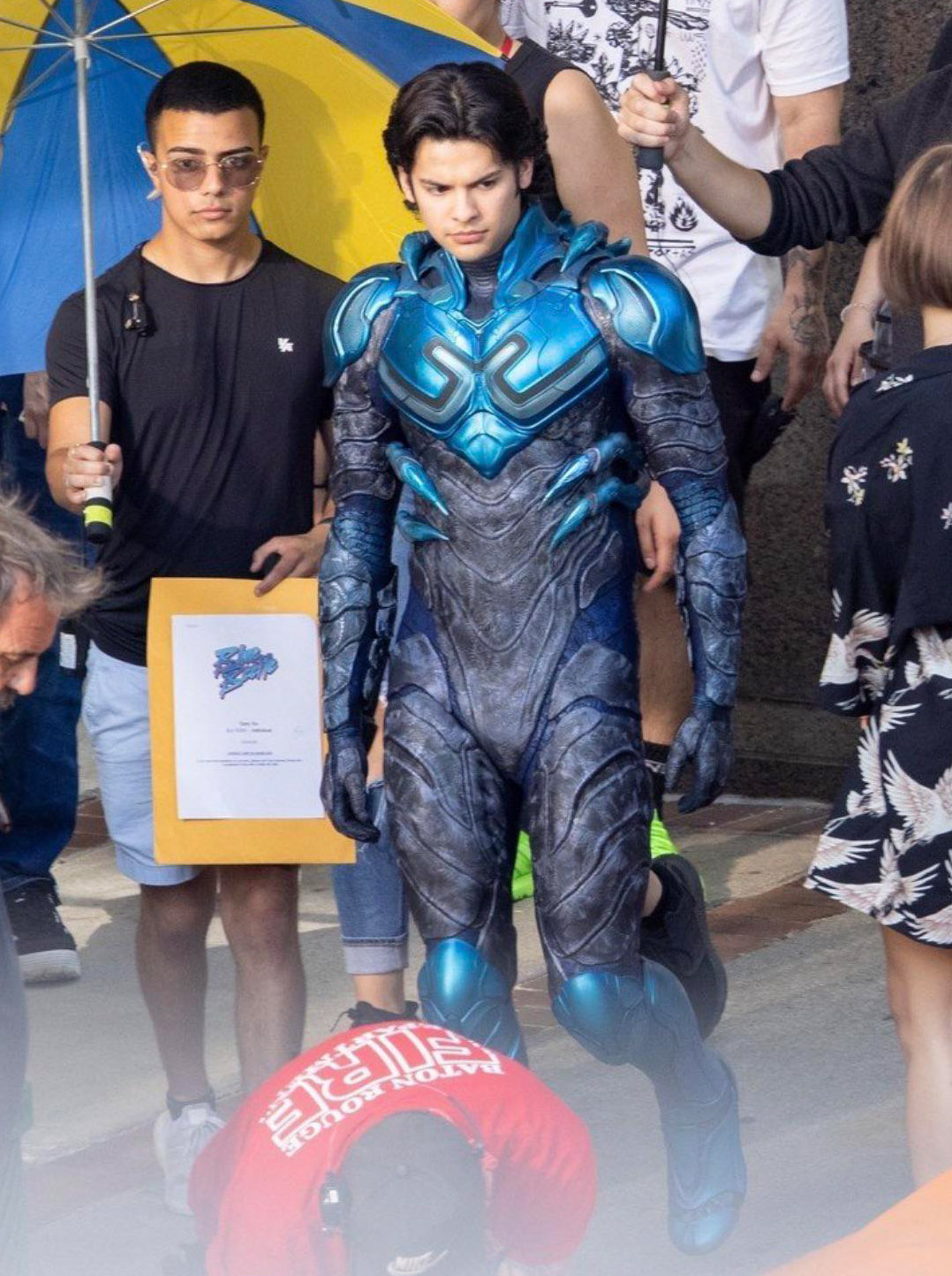 A atriz Bruna Marquezine ficou animada ao ver as fotos vazadas de seu primeiro filme americano, “Besouro Azul”, atualmente em produção na Warner. Mas o entusiasmo pareceu ter mais a ver com o colega de elenco, o ator Xolo Maridueña (“Cobra Kai”), que com a produção. Usando os stories, no Instagram, a artista apareceu com sorriso de orelha a orelha e perguntou em inglês a seus seguidores: “Have you guys seen the leaked photos of (Vocês viram as fotos vazadas de)”, acrescentando em seguida as fotos vazadas de Xolo Maridueña como Besouro Azul. “Ai, papi”, comentando ela na sequência, fingindo passar mal. As fotos vazadas movimentaram o dia nas redes sociais, por apresentar pela primeira vez o visual do herói do título. E ele é bem fiel aos quadrinhos. Escrita por Gareth Dunnet-Alcocer (do remake de “Miss Bala”), a trama vai se focar na terceira e mais recente versão do Besouro Azul nos quadrinhos, o que fará da produção o primeiro filme de super-herói latino feito nos EUA. A trama gira em torno de Jaime Reyes, jovem que ganha superpoderes ao encontrar uma tecnologia alienígena. Ao se fundir à sua espinha, o traje tecnológico extraterrestre possibilita ao adolescente do Texas aumentar sua velocidade e sua força, além de materializar armas, asas e escudos. Só que a Inteligência Artificial que acompanha a roupa quer usar esta mesma tecnologia para ajudar uma invasão da Terra. Bruna Marquezine foi escalada para viver o par romântico de Jaime Reyes. A personagem da brasileira tem sido chamada de Penny na imprensa, mas o diretor Ángel Manuel Soto (premiado no Festival de Sundance pelo drama indie “Twelve”), lhe chamou de Jenny num vídeo. Originalmente desenvolvido para a HBO Max, o filme mudou de rota e vai ser lançado exclusivamente nos cinemas em 18 de agosto de 2023.